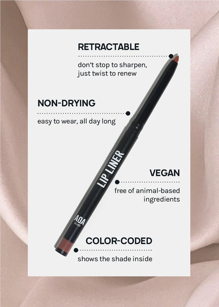 The AOA Wonder Lipliner is a collection of classic, retractable lip pencils in 9 gorgeous shades that fit all skintones. The buttery long-wearing lip liner formula defines the lip line, goes on easily and resists bleeding.The Wonder Liner provides perfect, allover, opaque lip coverage. cruelty-free.