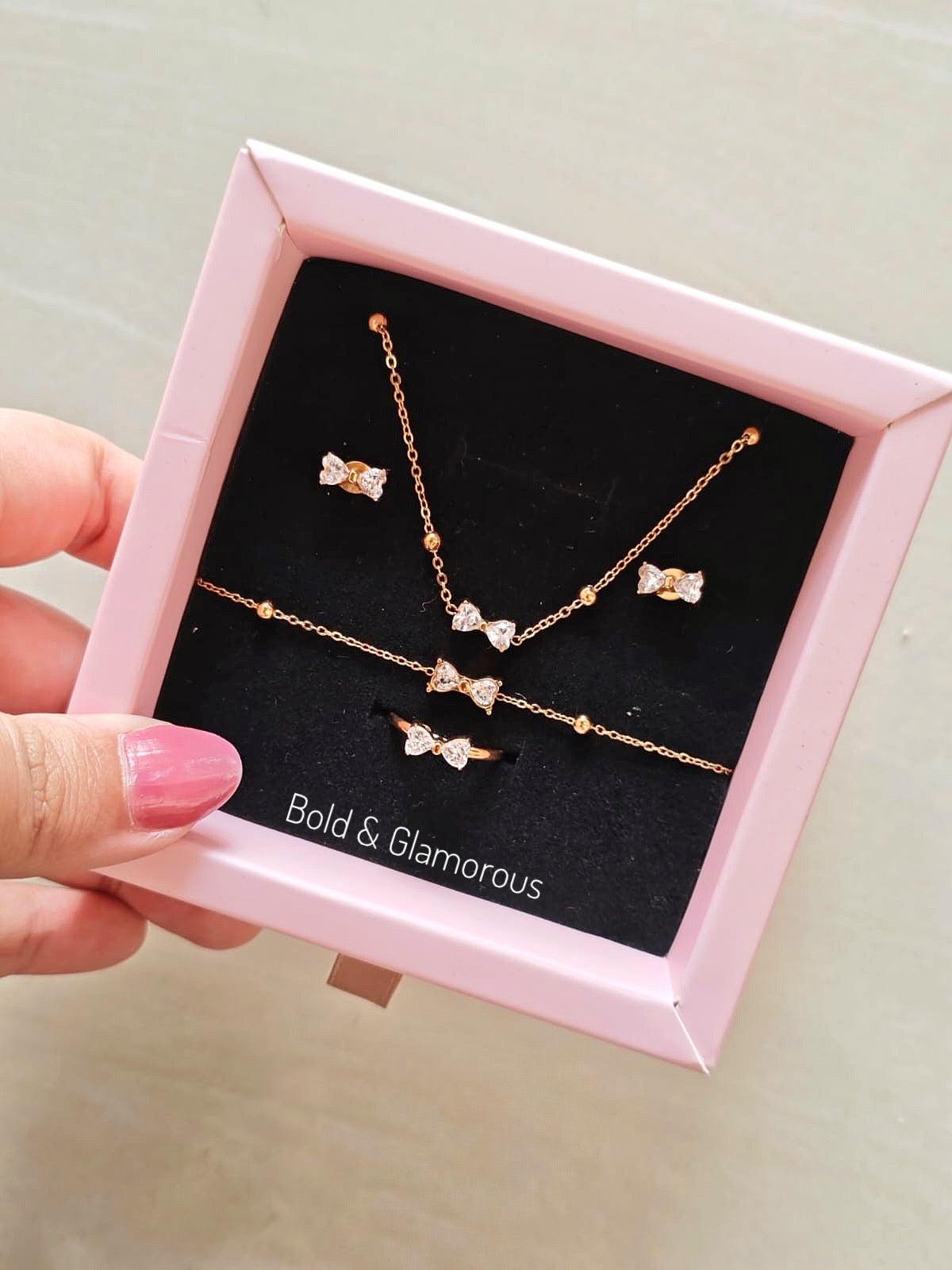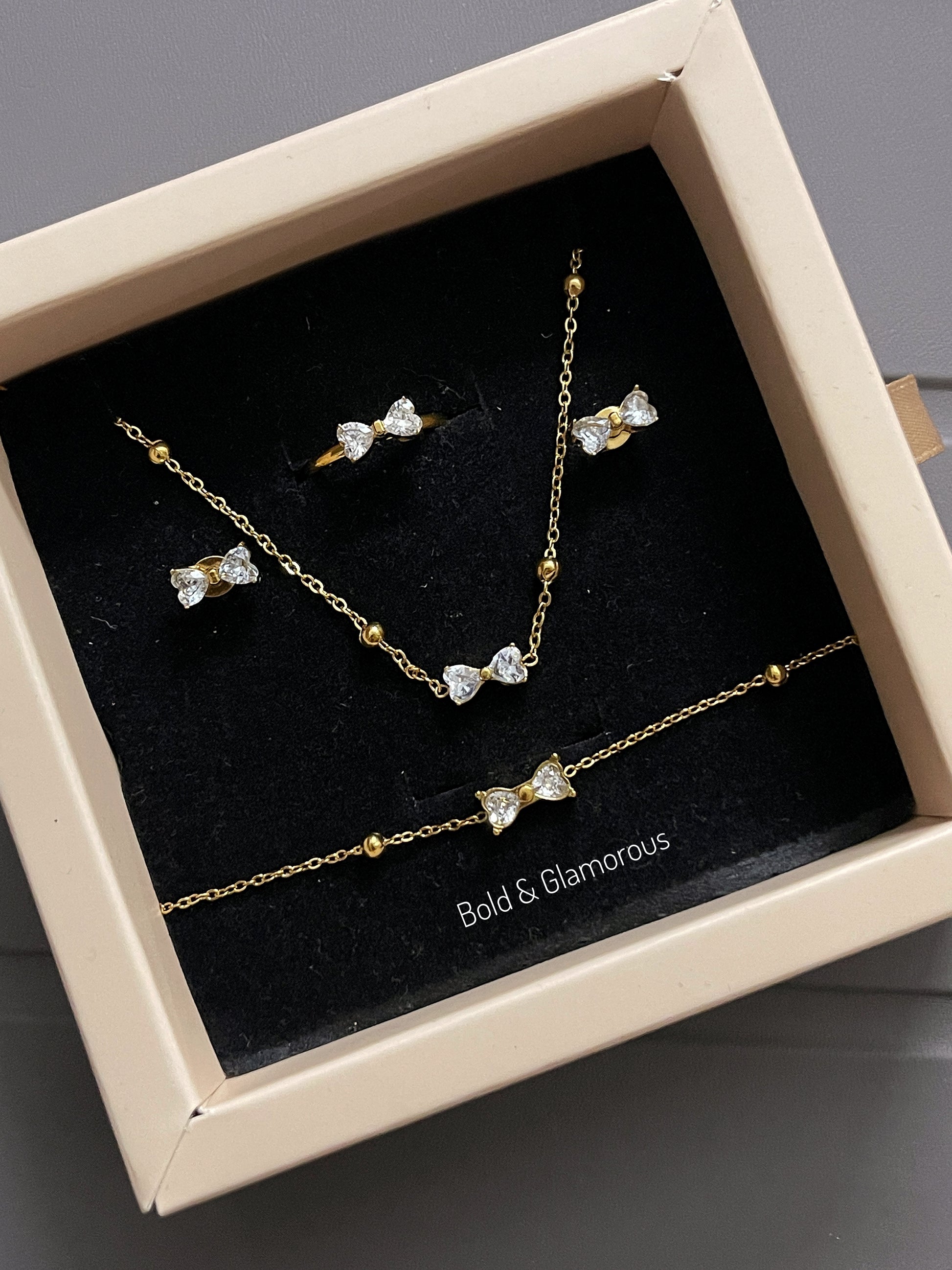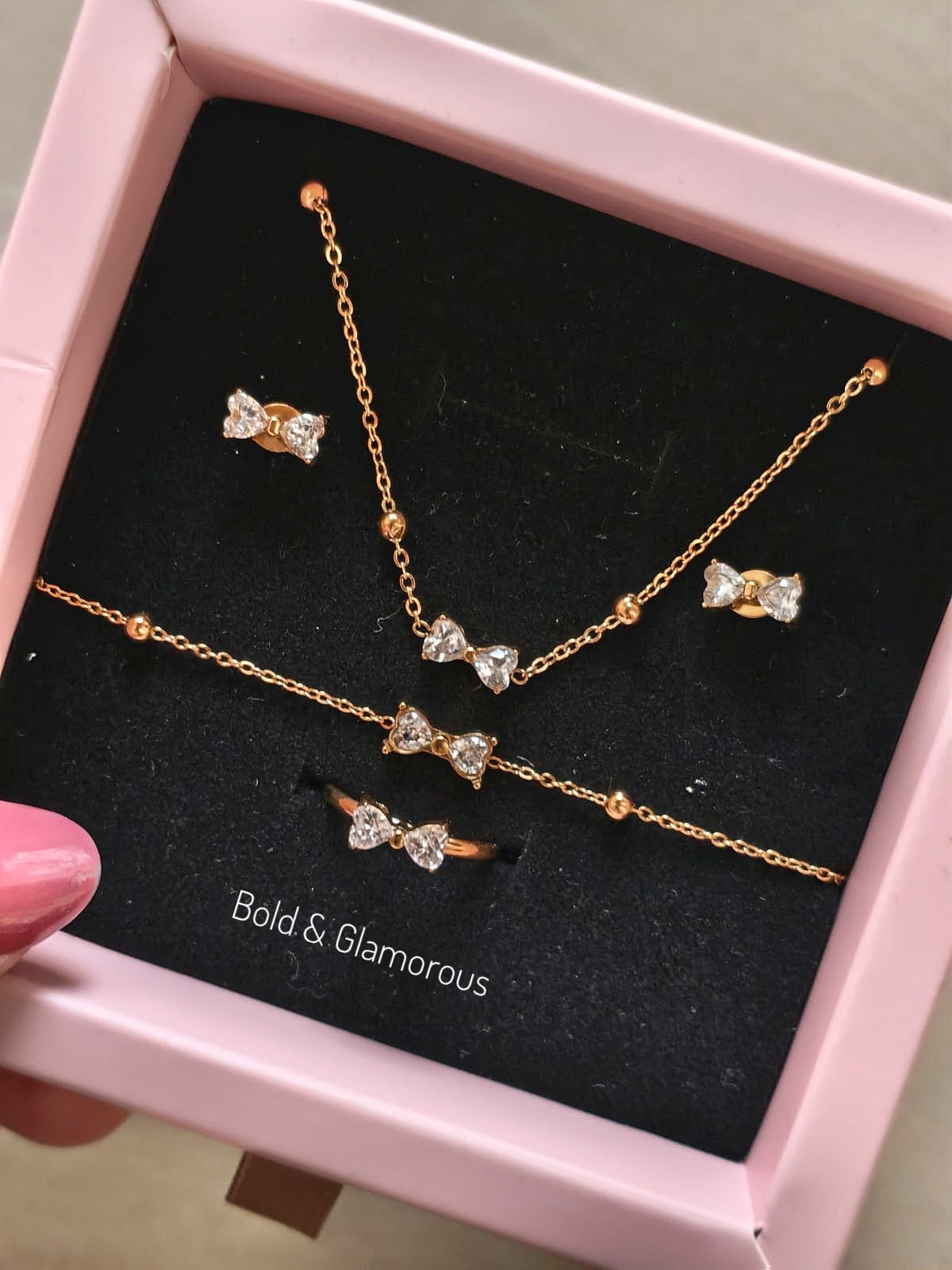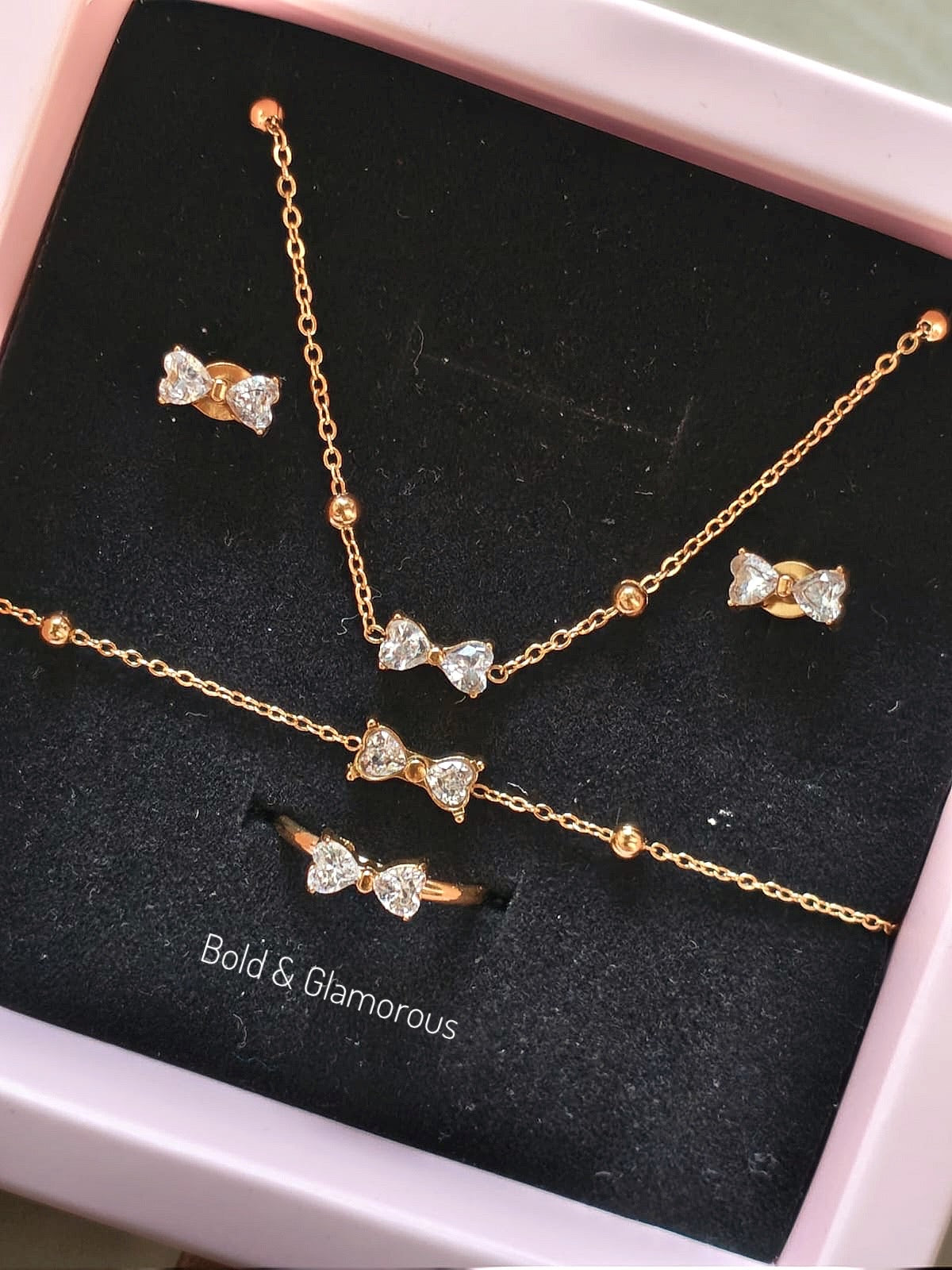 Complete your jewelry collection with this expertly curated four-piece bow set. Each piece—necklace, bracelet, ring, and earring—features lustrous stone detailing for a cohesive, polished look. The ensemble arrives in a premium pink presentation box, perfect for gifting or elevating your personal accessory wardrobe with coordinated elegance and timeless appeal.